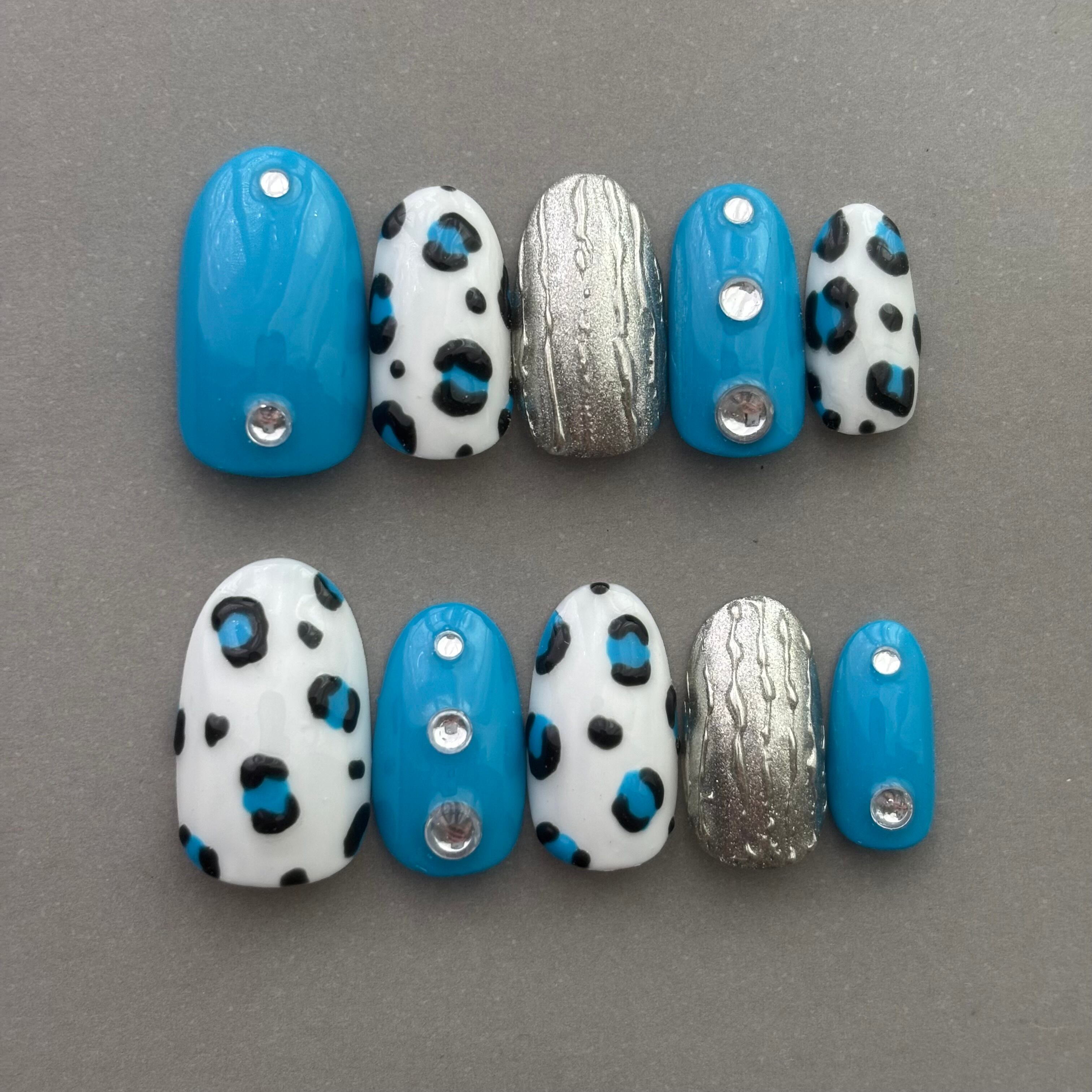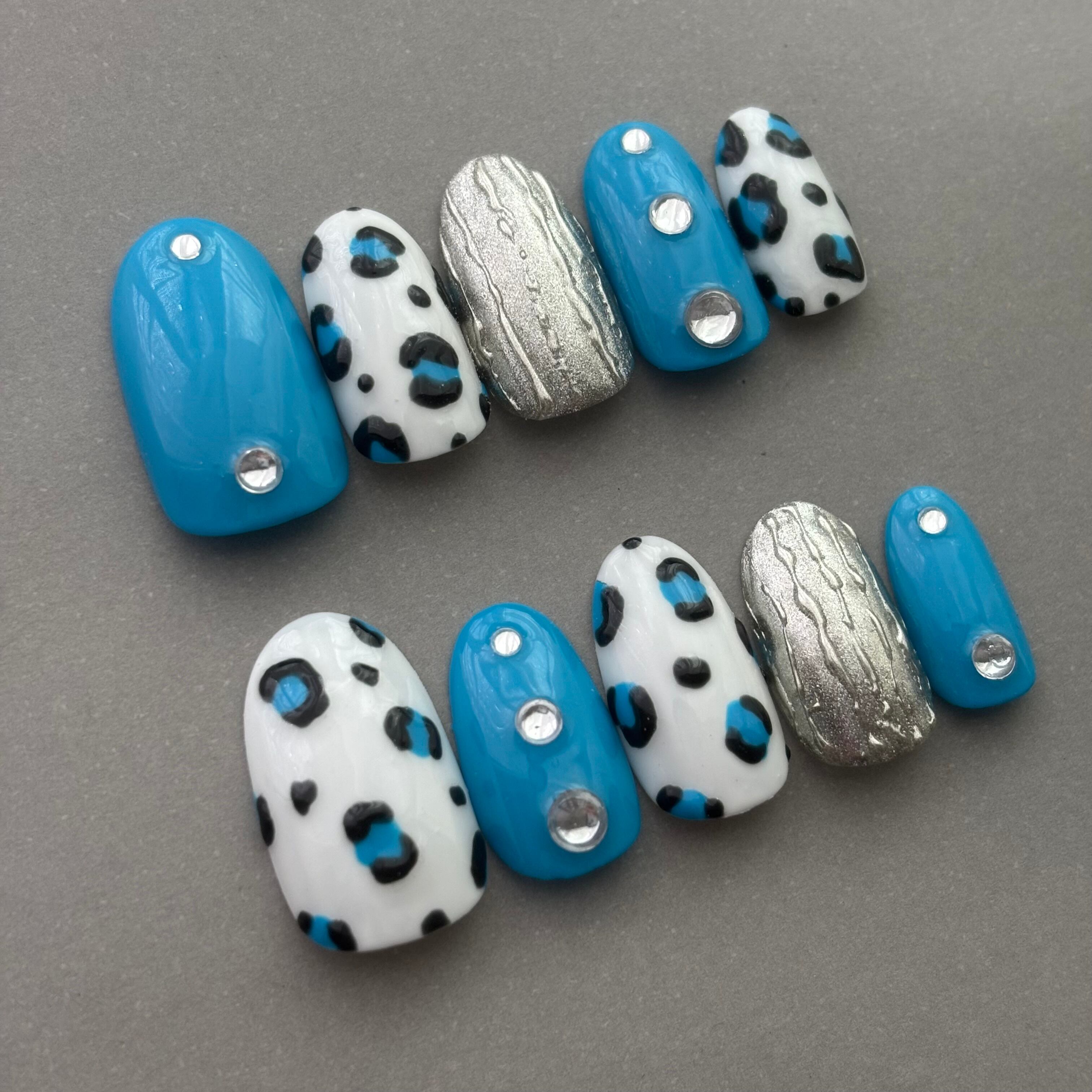 ネイルチップ/個性派 ヒョウ柄 ギャル 水色 白 シルバー ラメ ミラー 海外