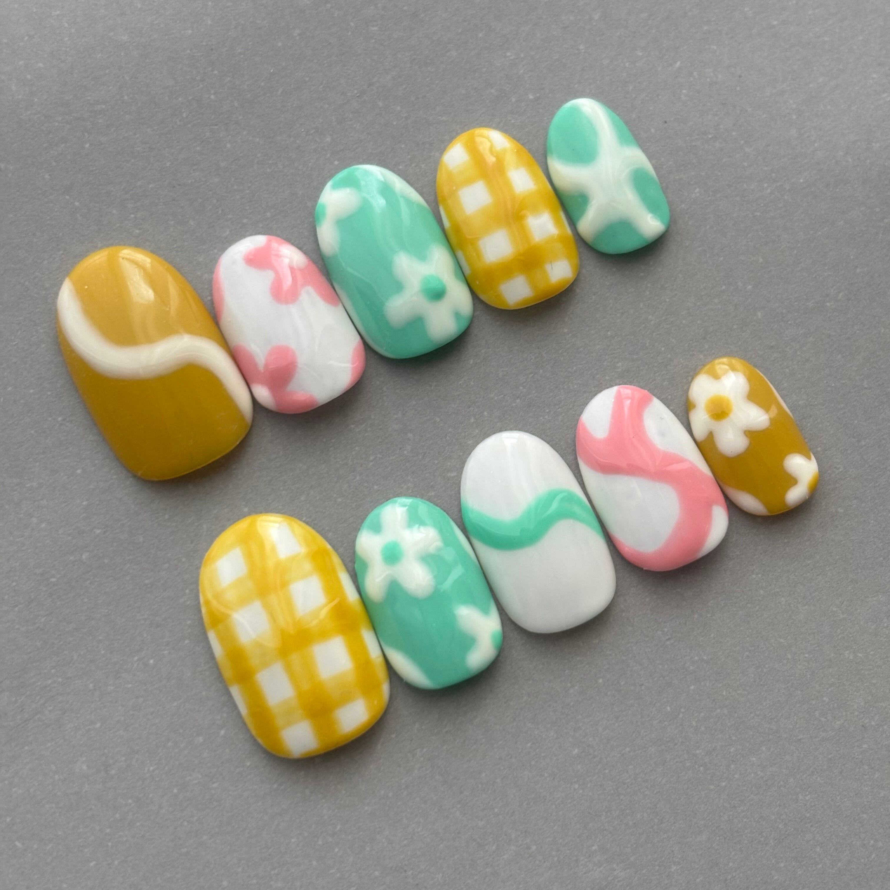 ネイルチップ/個性派 パステル チェック うねうね フラワー 黄色 緑 ピンク白