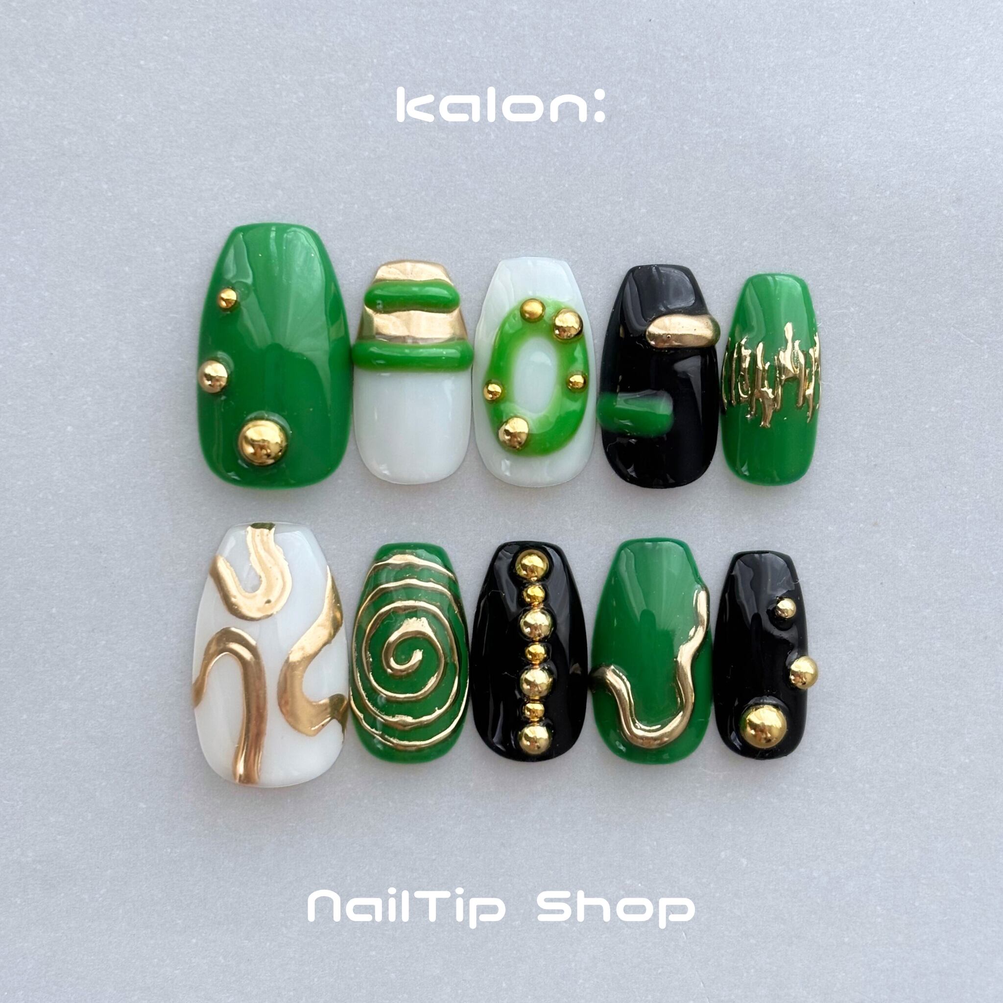 ネイルチップ/ニュアンス 個性派 海外 緑 黒 ゴールド モダン