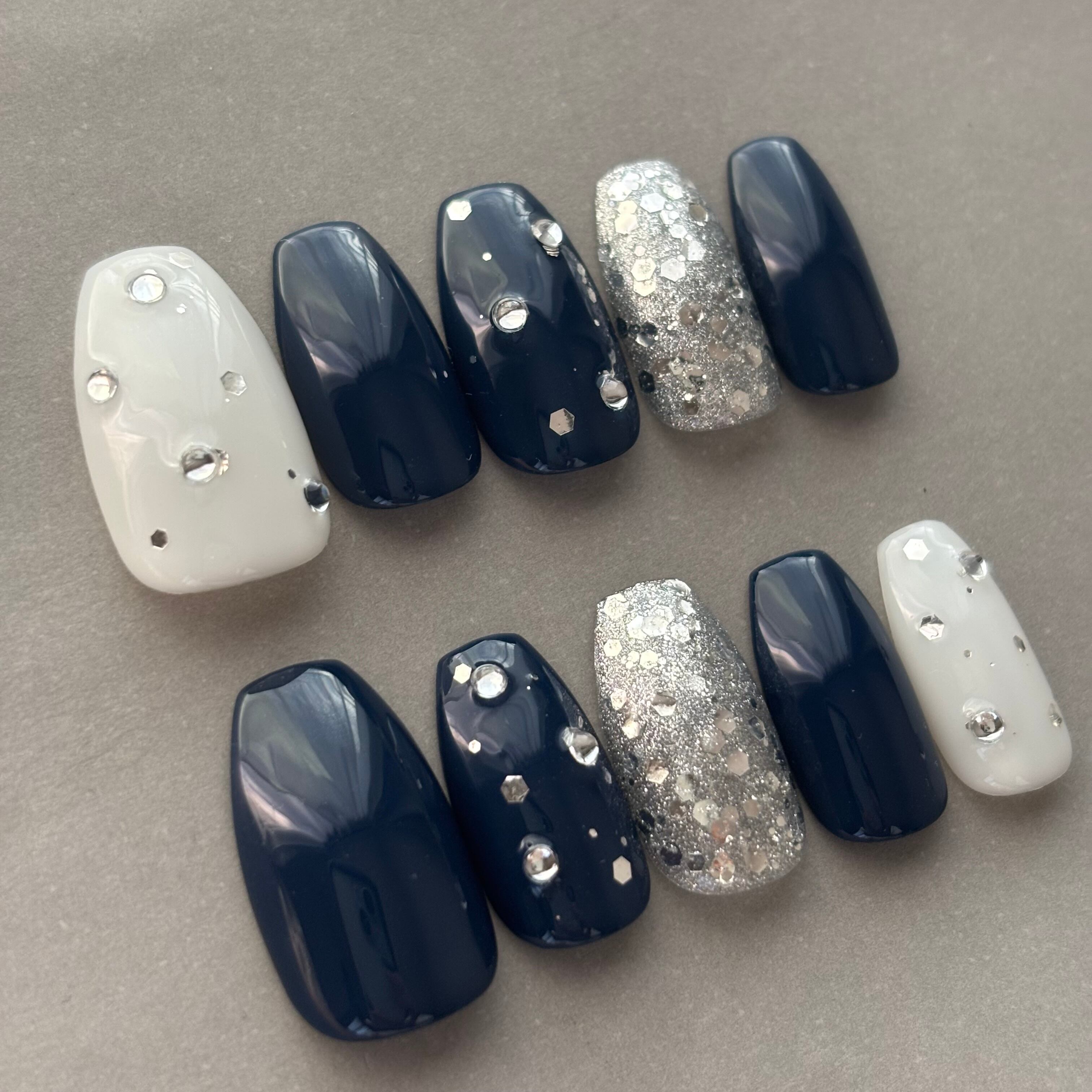 ネイルチップ/シンプル ネイビー ホワイト シルバー 大人 キラキラ
