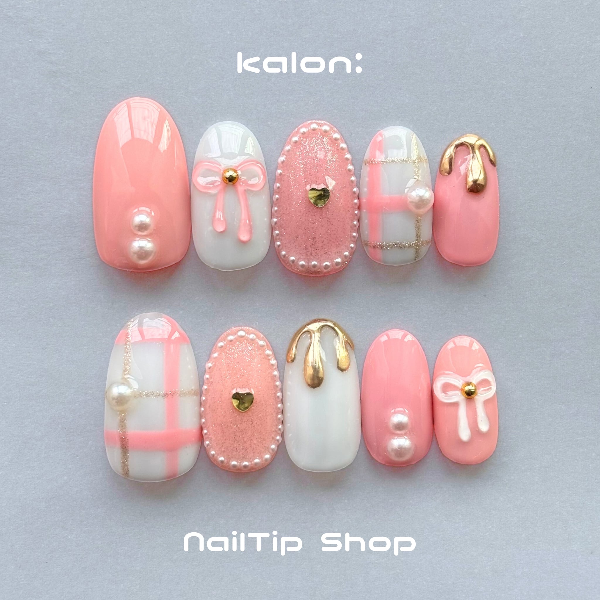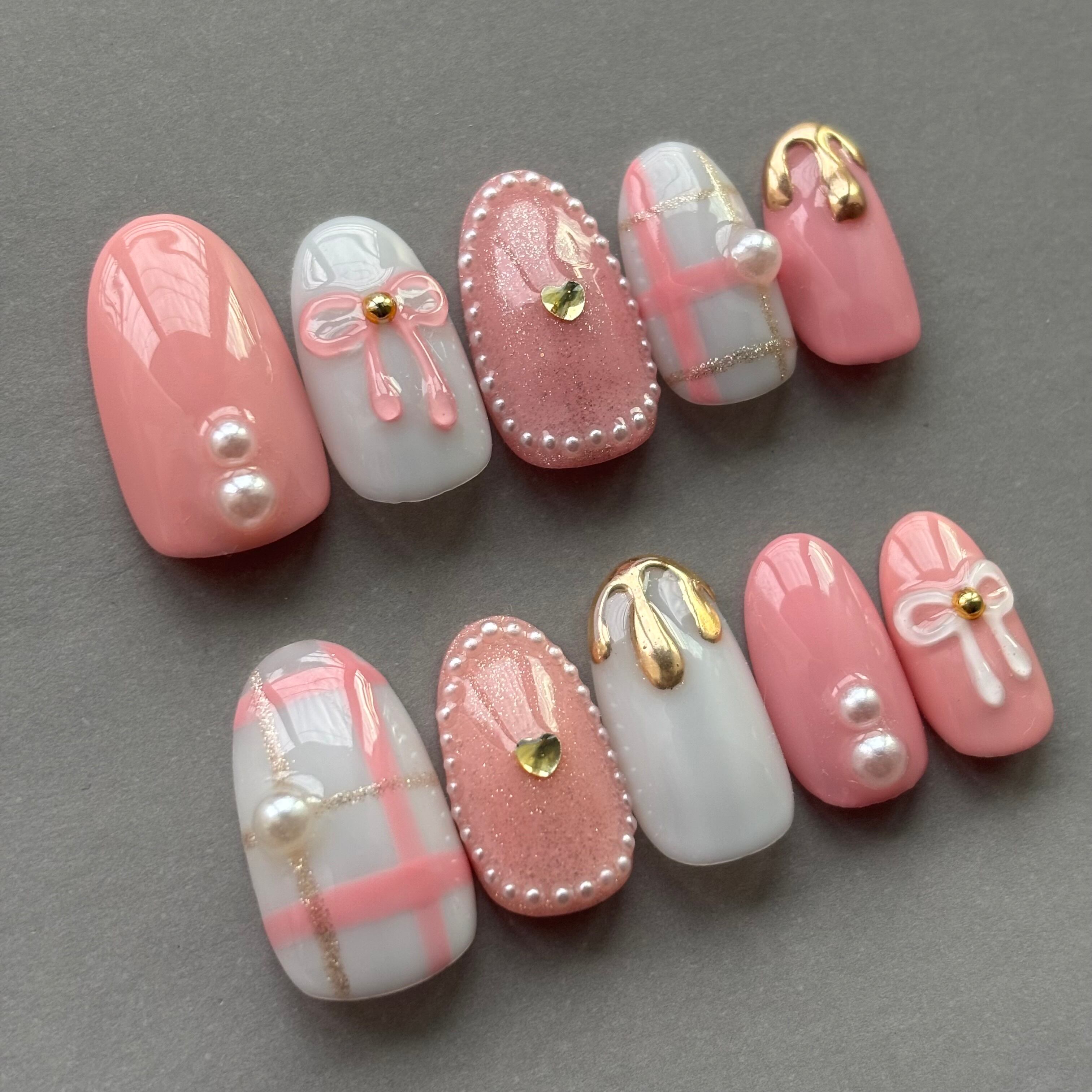 ネイルチップ/チェック リボン パール ハート ぷっくり ガーリー