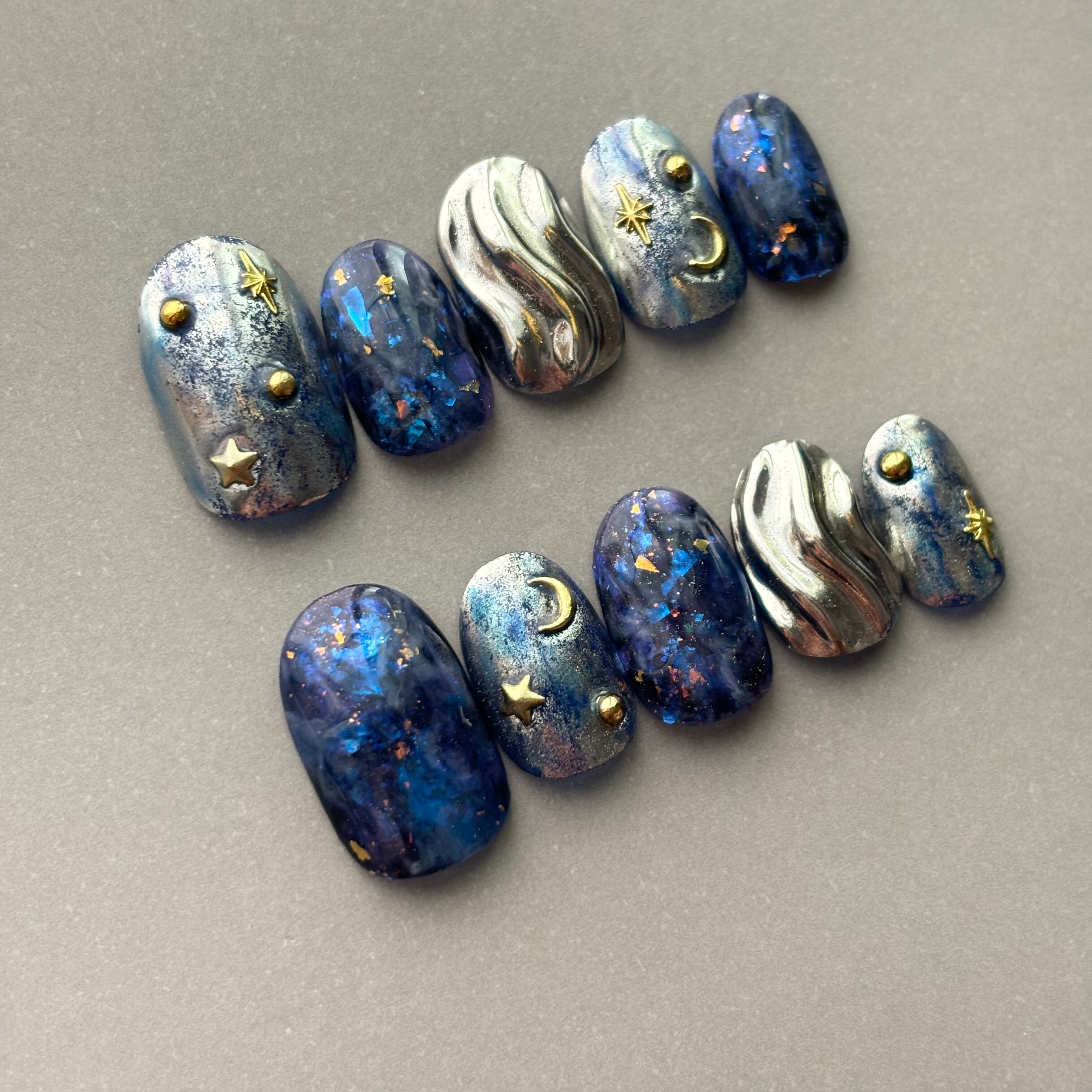 ネイルチップ / ギャラクシーネイル ブルー シルバー キラキラ 月 星