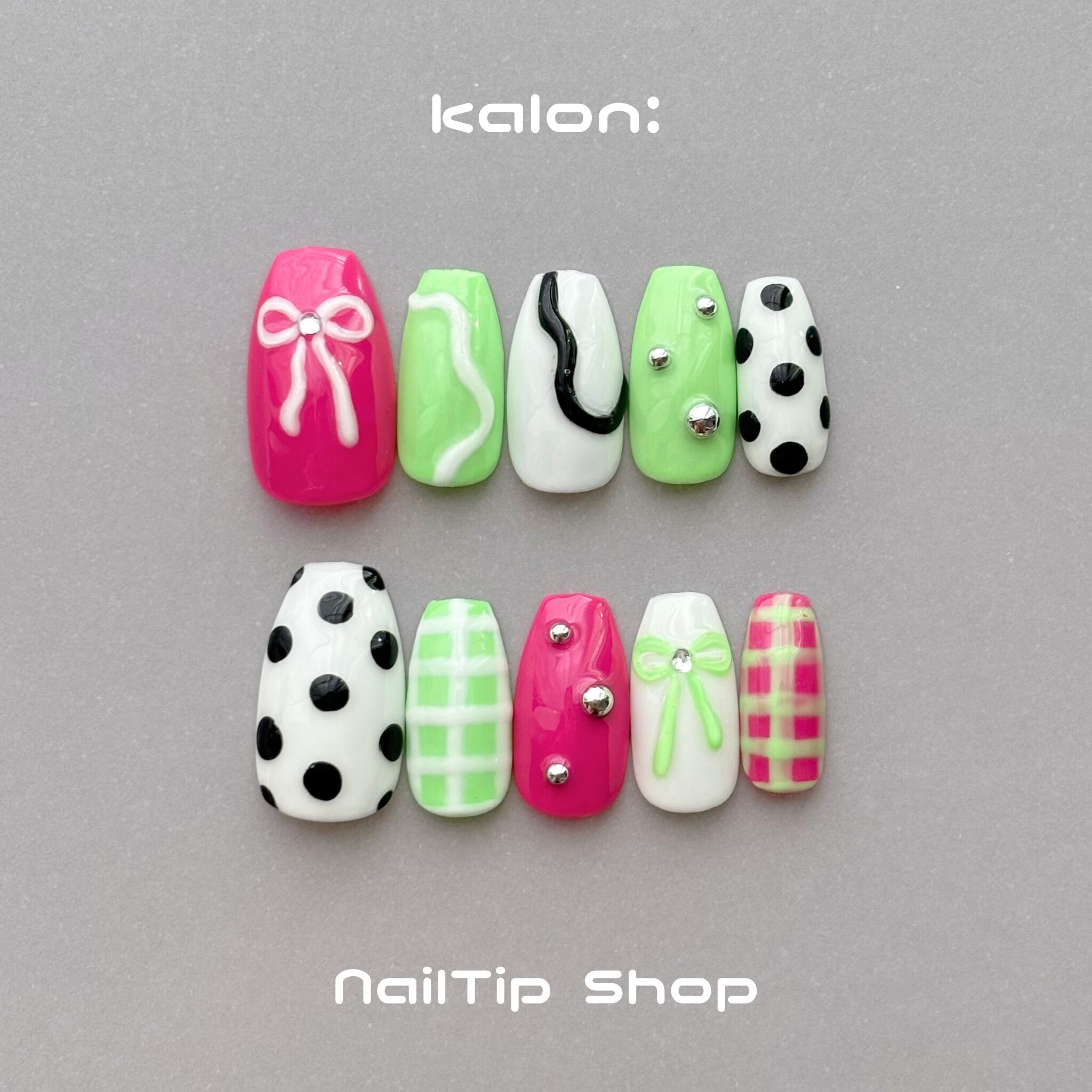 ネイルチップ / 個性派ネイル ピンク グリーン ホワイト リボン ドット チェック ぷっくり