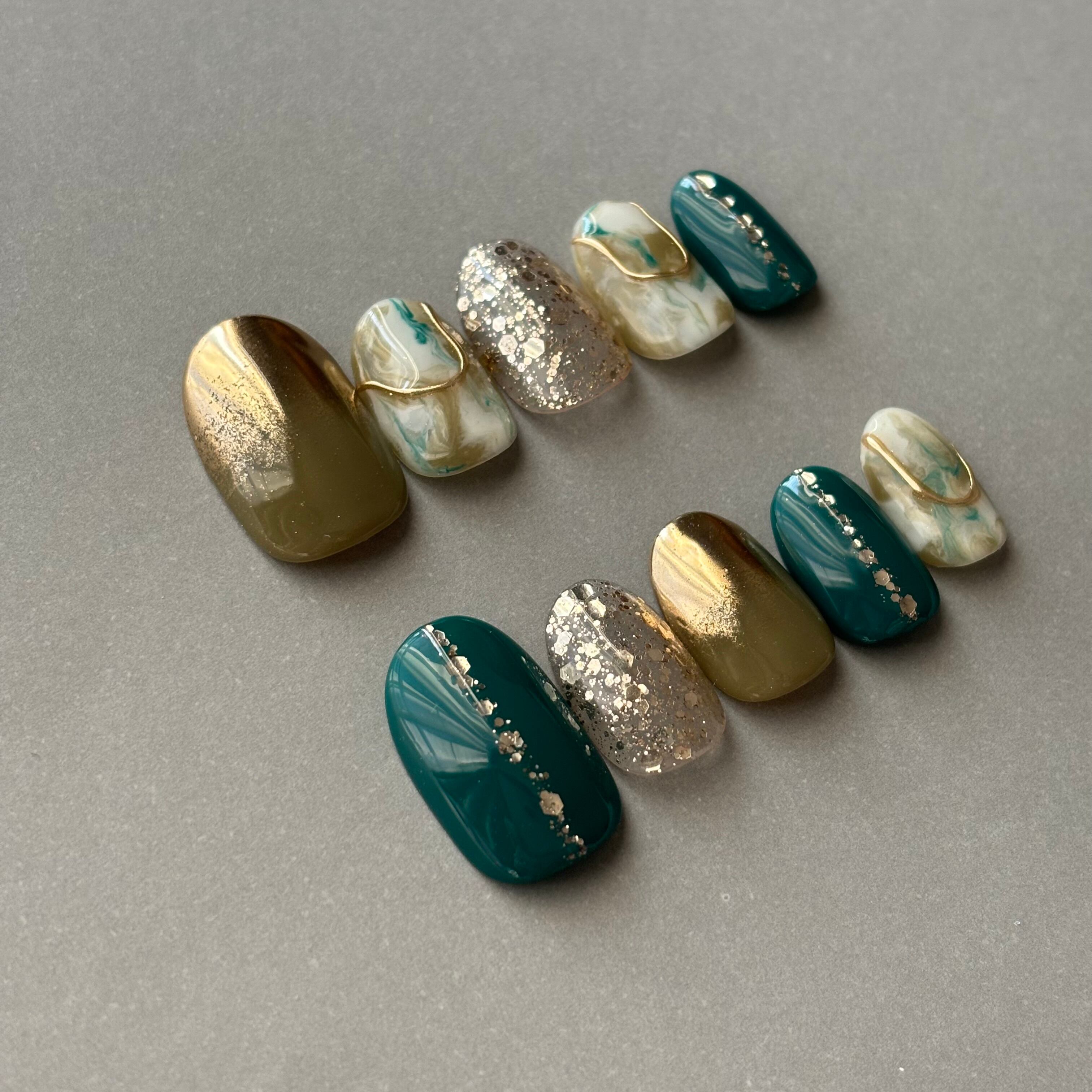 ネイルチップ / ニュアンスネイル クリスマスネイル グリーン ゴールド グリッター ワンカラー